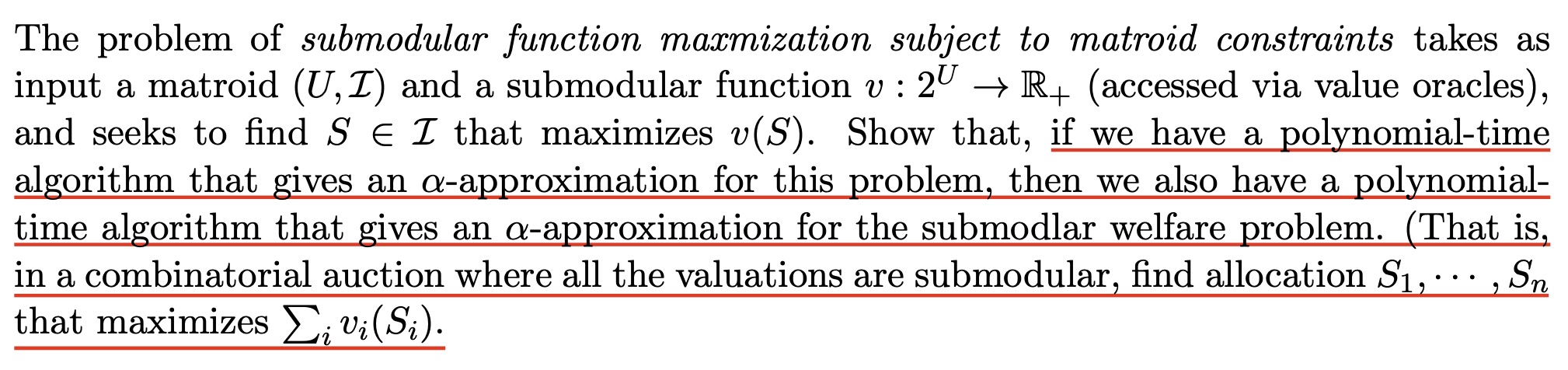 - [submodular welfare maximization] >= [maximize a monotone submodular function s.t. matroid constarint] (Is it true though?).