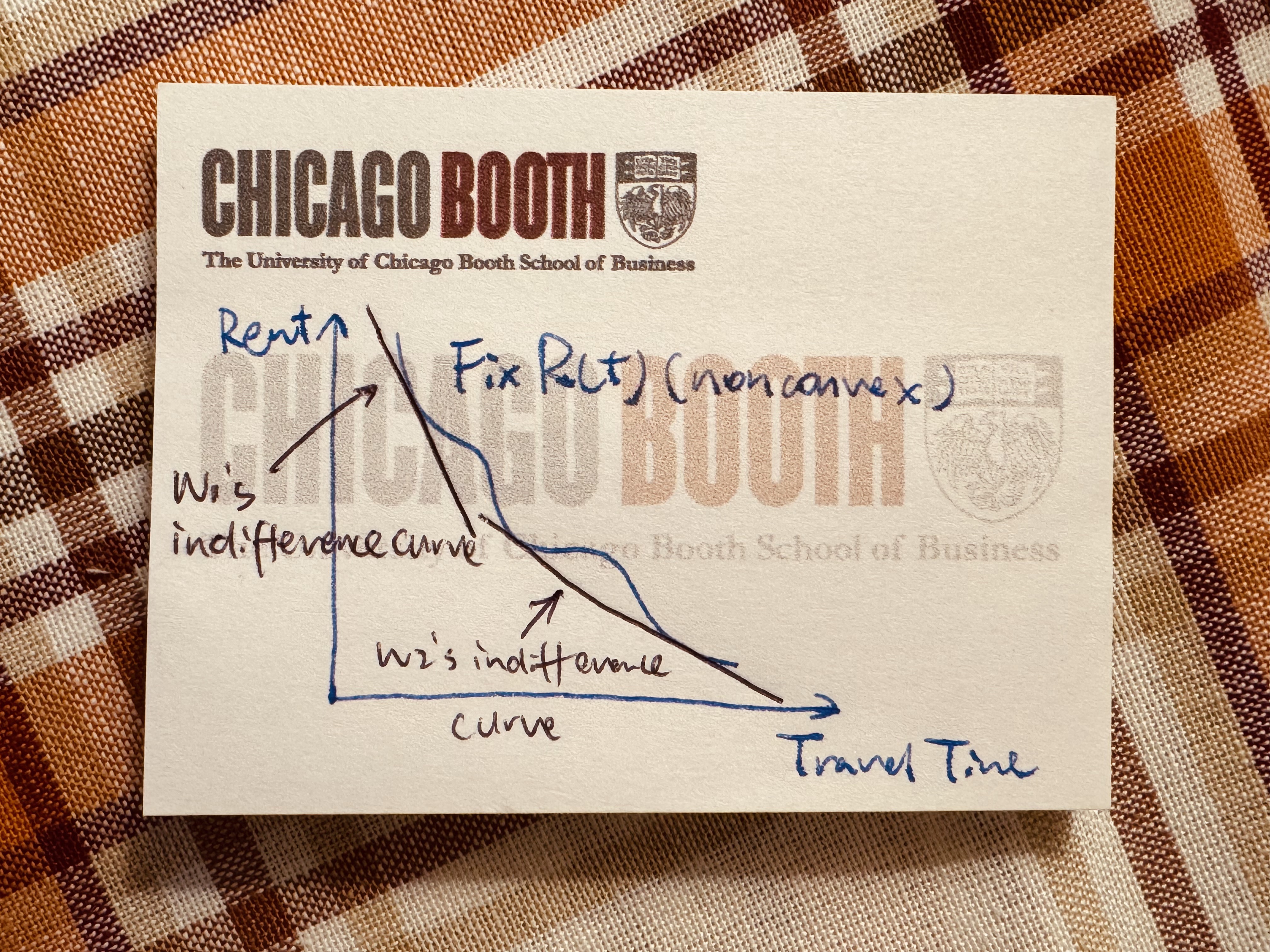 The Chicago Price Theory (2019) Chapter 8 Location Choice features the following model: $$ \begin{align*} \max_{C, L, t} & \ U(C, L)\cr s.t.&\ C =\alpha + w(24 - L - t) - R(t)\cr & L, t\in [0, 24], C\ge 0. \end{align*} $$ where, $C$ is consumption (think of it as money), $L$ is leisure time, and $t$ is travel time, $R(t)$ is the rent function, assume it be decreasing. $w$ is individual’s wages. Being nice today, let’s assume $U$ is strictly concave.