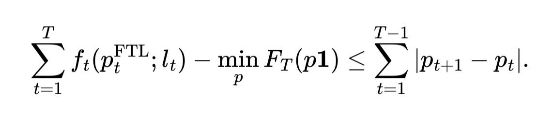 Def Be-The-Leader (BTL). At time $t$, the algorithm chooses the action distribution that minimizes loss, knowing the current periods’ loss and history: $$ p_t^\text{BTL}:= \arg\min_{p\in [0, 1]} F_{t}( p\mathbf 1). $$ Lemma 1 (Bounded regret of any FTL w.r.t. $\vec l$) For any instance $l_1, \ldots, l_T$: