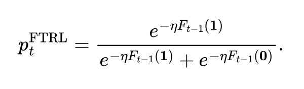 Def Follow-The-Regularized-Leader (FTRL). At time $t$, the algorithm chooses the action distribution that minimizes regularized ex-post loss: $$ p_t^\text{FTRL}:= \arg\min_{p\in [0, 1]} F_{t - 1}( p\mathbf 1) + \frac1\eta R( p). $$ $R(\cdot)$ is strongly convex. For example, a classic choice of $R(\cdot)$ is negative entropy: $$ R(p) = p \log p + (1 - p) \log (1 - p). $$ In this case, $p^\text{FTRL}_t$ solves to be