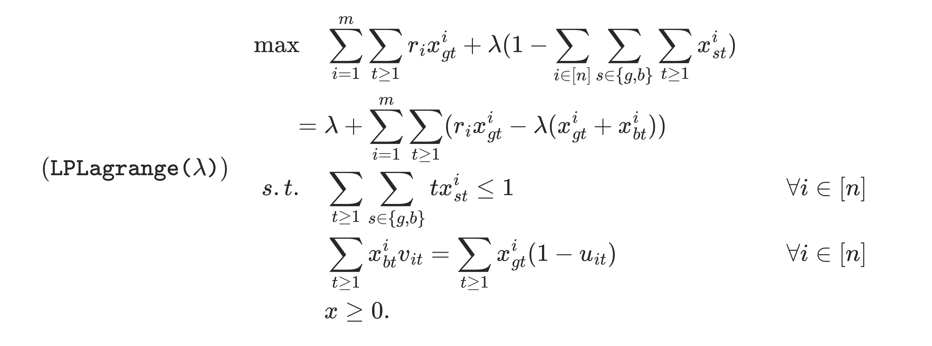To begin with, notice that $\texttt{LPLagrange($\lambda$)}$ and its $\texttt{Dual($\lambda$)}$ yield $n$ disjoint max (min) problems, one for each arm $i$—the constraints are already disjoint in arms. Furthermore, the objective function of $\texttt{LPLagrange($\lambda$)}$ can be rewrite as $$ \lambda + \sum_{i = 1}^m \sum_{t\ge 1}(r_i x_{gt}^i - \lambda(x_{gt}^i + x_{bt}^i)) $$ which can be interpreted as, whenever each arm is played, a penalty $\lambda$ is incurred to the reward.