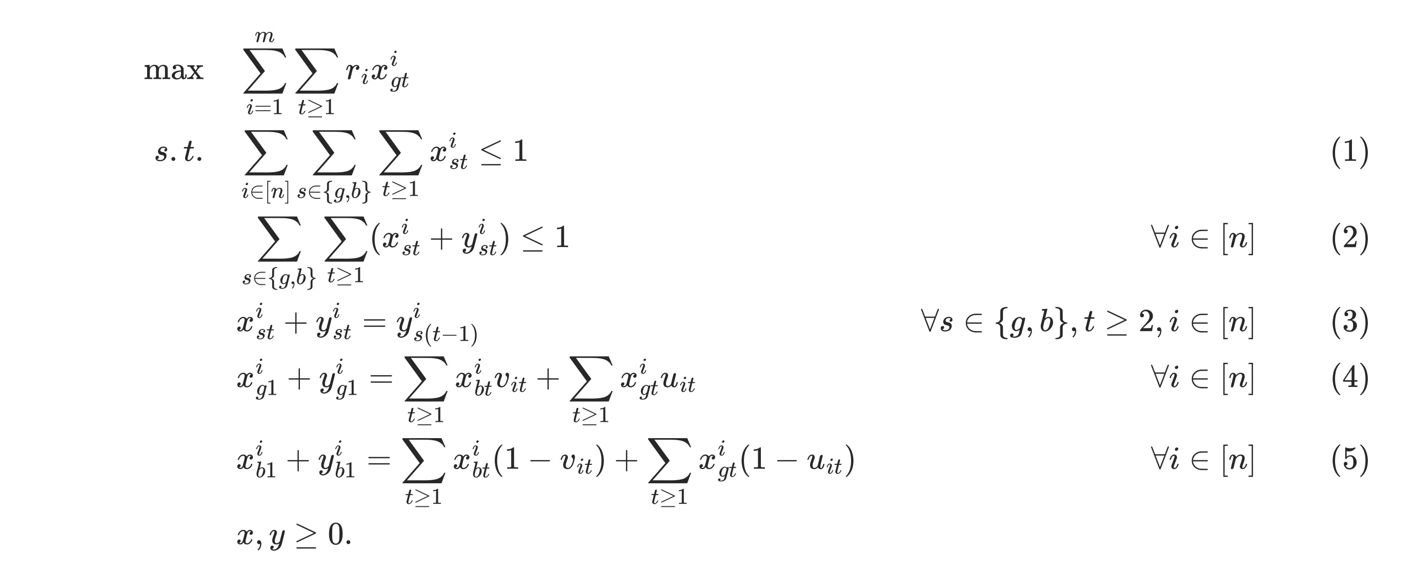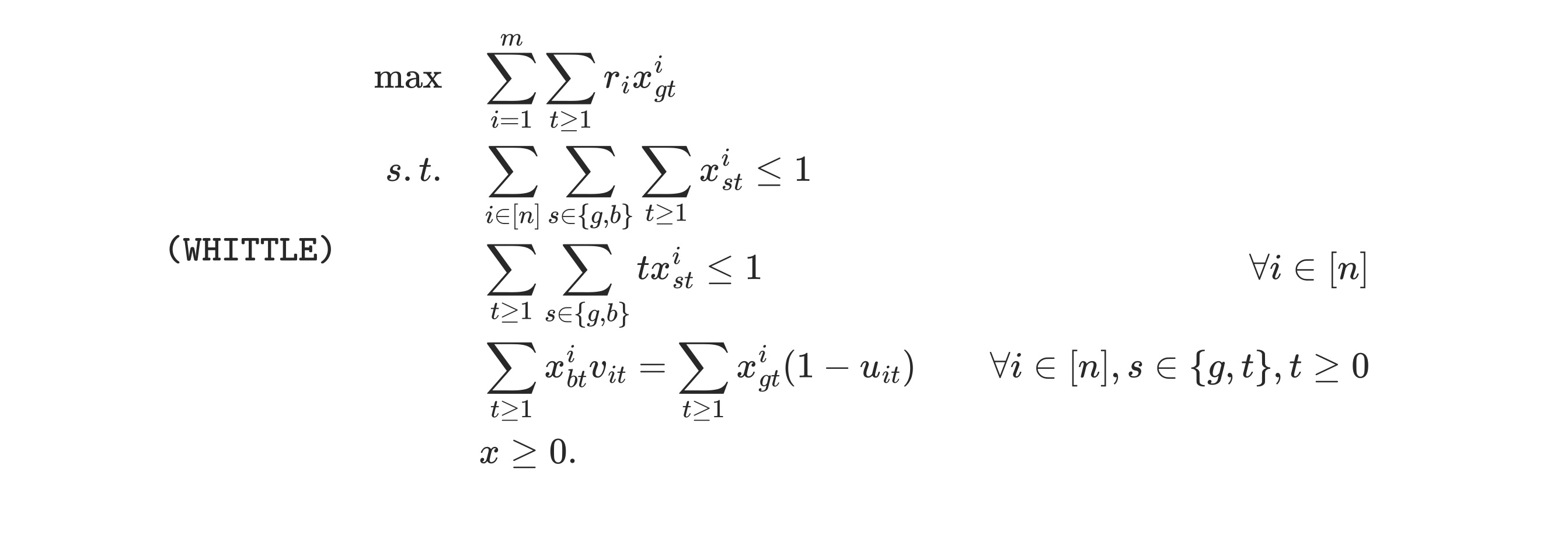 Note that $y_{st}^i = \sum_{\tau > t}x_{st}^i$. We can hence replace all $y$ variables, and the last two transition constraints above collapse into the same constraint (which is a common property you can expect in most RMAB’s Whittle LPs). And we have the following significantly clearer and natural LP formulation to work on, that later will leverage the structure of the Whittle LP to give a lot of surprising results: