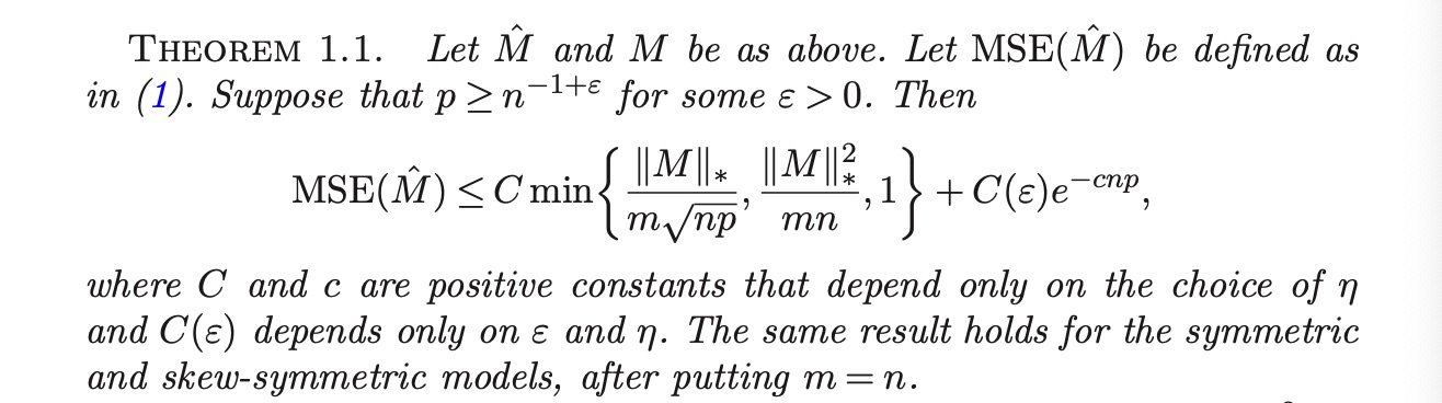 And, recall that MSE is just 1/mn times Frobenius norm $$ \mathrm{MSE}(\hat M) = \frac1{mn}\mathbb E[\Vert \hat M - M\Vert_F^2]\le\frac{C\Vert M\Vert_*}{m\sqrt{np}} + Ce^{-cnp}. $$